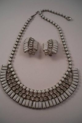 Vintage Milk Glass Rhinestone Necklace Earring Set