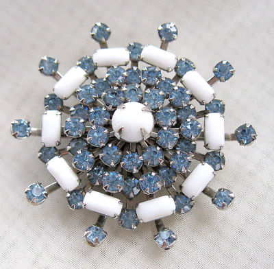 VINTAGE PRONG SET MILK GLASS & BLUE RHINESTONE BROOCH