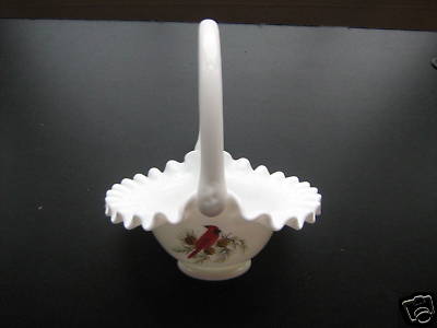 FENTON Milk Glass Hand Painted Cardinal BASKET BOWL EXC