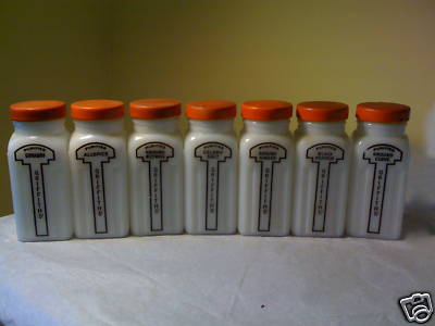 Vintage Griffiths Milk Glass 7 Spice Jars Shakers Set