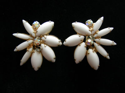 VTG Gold White Milkglass AB Rhinestone Clip Earrings