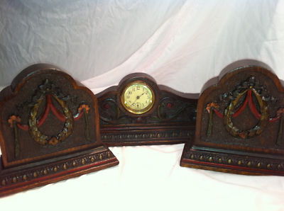 Antique Carved Oak Mantle Clock & Bookends Set 1890's