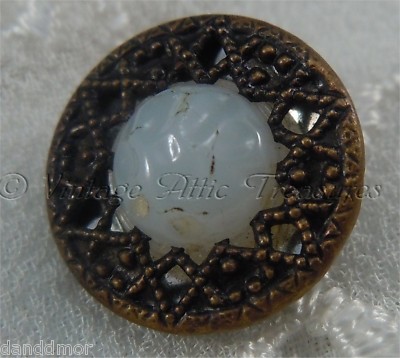 Victorian Metal Waistcoat Mirror Back Button Milk Glass