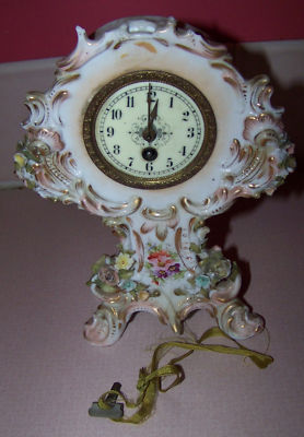 ANTIQUE PORCELAIN SHELF MANTEL CLOCK WITH KEY
