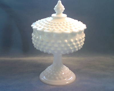 8 1/2 inch Hobnail Milk Glass Footed Candy Jar w/cover