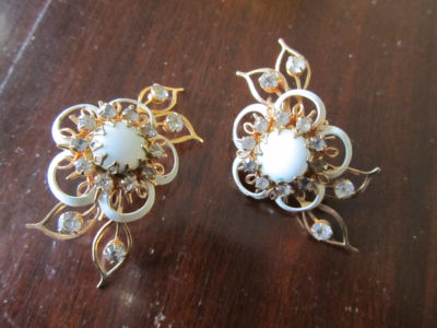 STRIKING VINTAGE MILK GLASS RHINESTONE KRAMER EARRINGS