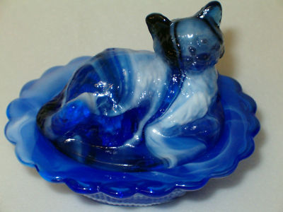 COBALT & MILK SLAG GLASS CAT KITTEN ON NEST BASKET SALT