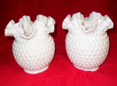 2 Vintage Hobnail Ruffled Round Vase Milk Glass Fenton?