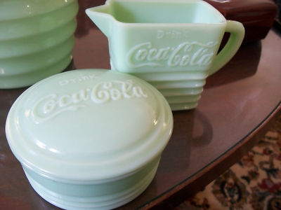 Title (ebay affiliate link): jadiete green glass coca cola creamer and candy jar
