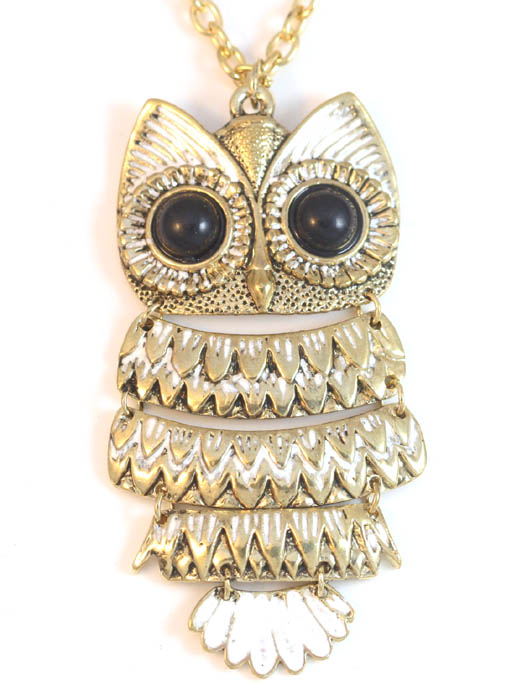 Title (ebay affiliate link): Antique Gold Owl Boho White Enamel Pendant Necklace