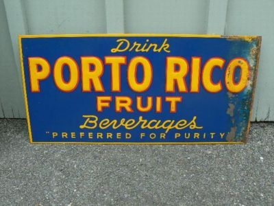 Title (ebay affiliate link): 1940s Vintage Tin PORTO RICO Fruit Beverages SODA Sign