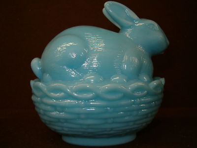 Title (ebay affiliate link): BONNIE BLUE MILK GLASS BUNNY RABBIT ON NEST DISH OPAQUE