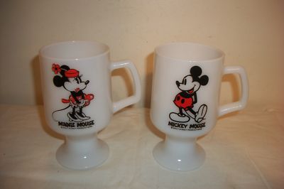 2 Walt Disney Minnie Mickey Mouse Mugs Milk Glass