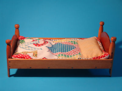 ANTIQUE WOODEN DOLL BED WITH MATCHING BEDSPREAD