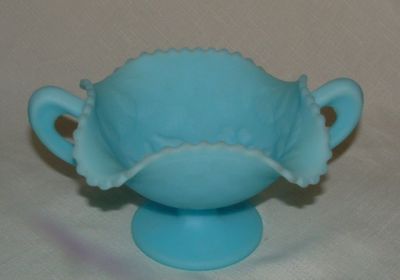 FENTON BLUE MILK GLASS FOOTED HDL. BOWL FRUIT DESIGN