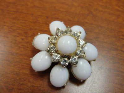 VINTAGE WHITE MILK GLASS & RHINESTONE FLOWER PIN