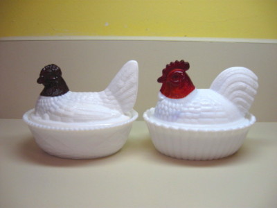 ROSSO GLASS 5" ROOSTER/HEN ON NEST SET MILKGLASS/RED