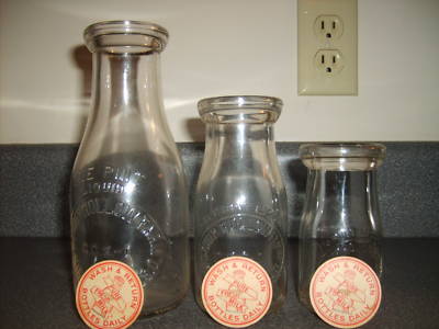 Set of 3 Glass Milk Bottles (1/4, 1/2 & 1 pint) w/ lids
