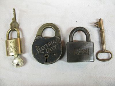 Title (ebay affiliate link): 4 Antique Brass Padlocks & Keys Electric City Giant WB