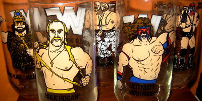 Title (ebay affiliate link): Vtg Set of 5 WWF Glasses Hulk Hogan Macho Man WWE 80s