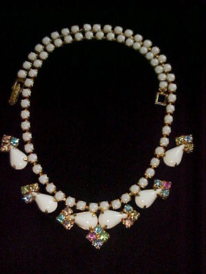 PRETTY VINTAGE MILK GLASS & PASTEL RHINESTONE NECKLACE