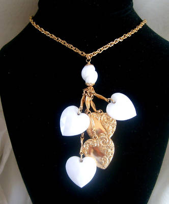 VINTAGE WHITE MILK GLASS HEART CHARM DANGLING NECKLACE