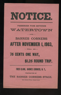 1903 Watertown Barnes Corners NY stagecoach broadside