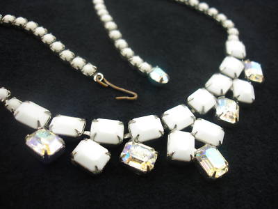 Vintage White Milk Glass AB Rhinestone Fringe Necklace