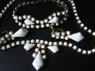 WEISS STYLE WHITE MILK GLASS NECKLACE BRACELET EAR SET