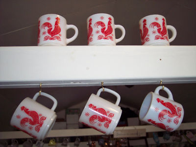 MILK GLASS CUPS LOT OF 6 WITH BIG RED ROOSTERS ON THEM