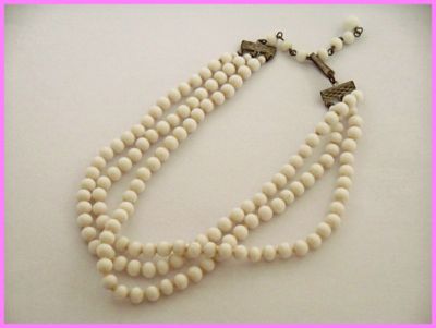 VINTAGE~JAPAN~3~STRAND~MILK~GLASS~BEAD~CHOKER~NECKLACE