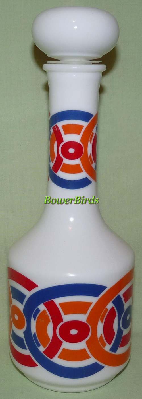 Retro Milk Glass Decanter,Red,Blue & Orange pattern.