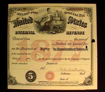 Antique 1877 TOBACCO CIGARS PIPES SCOTCH Tax Americana