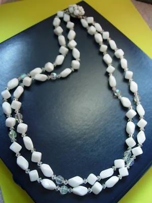 Vintge WHITE MILK GLASS AB RHINESTONE 2 STRAND NECKLACE