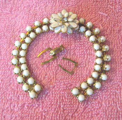 Vintage Milk Glass Flower Rhinestone Bracelet