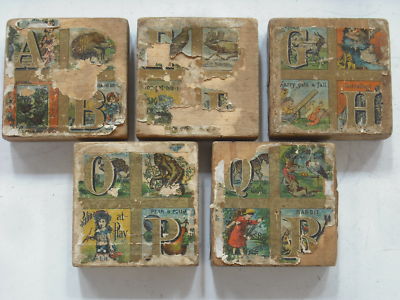 5-Vintage childs wood blocks, decorated, 3 3/4"sq x7/8"