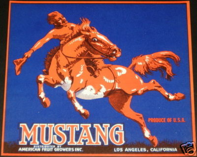 MUSTANG~COWBOY on HORSE~RARE VINTAGE ORANGE CRATE LABEL