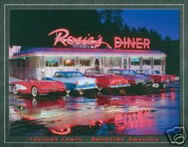 Title (ebay affiliate link): Retro Autos at Rosie's Diner Lucinda Lewis tin sign