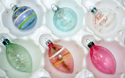 Title (ebay affiliate link): Six Smaller World War II Corning Glass Xmas Oraments