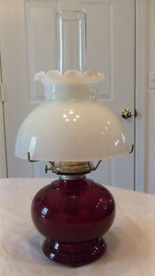 Vintage Ruby Red Kerosene Oil Lamp w/ Milk Glass Shade