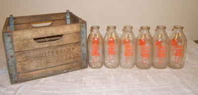 6 Old dairy milk bottle w wooden crate Price's qt Moste