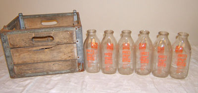 6 Old dairy milk bottles w wooden crate Price's qt NR l