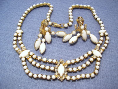VINTAGE MILKGLASS &CLEAR RHINESTONE NECKLACE & EARRINGS