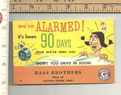 1955 Pontiac 90day Service reminder PC NOS Indian/Ohio