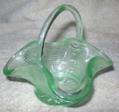 Title (ebay affiliate link): SMALL VINTAGE GREEN DEPRESSION GLASS FLOWER BASKET