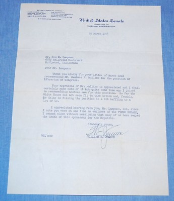Title (ebay affiliate link): 1954 SENATE LETTER WILLIAM JENNER ABOUT EUSTACE MULLINS