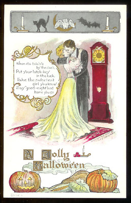 Antique Postcard, Halloween, Lovers & Clock, 1908