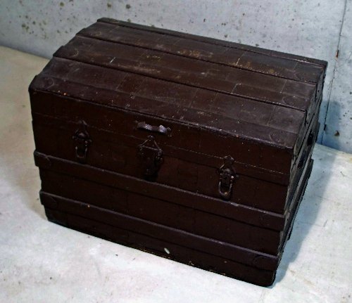 Title (ebay affiliate link): Metal Banded Cloth Covered Antique Wood Trunk w/Keys