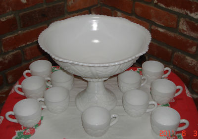 McKee Milk Glass Punch Bowl, Base, & 11 cups