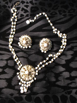 Vintage White Glass Milk Bead Rhinestone Necklace Set